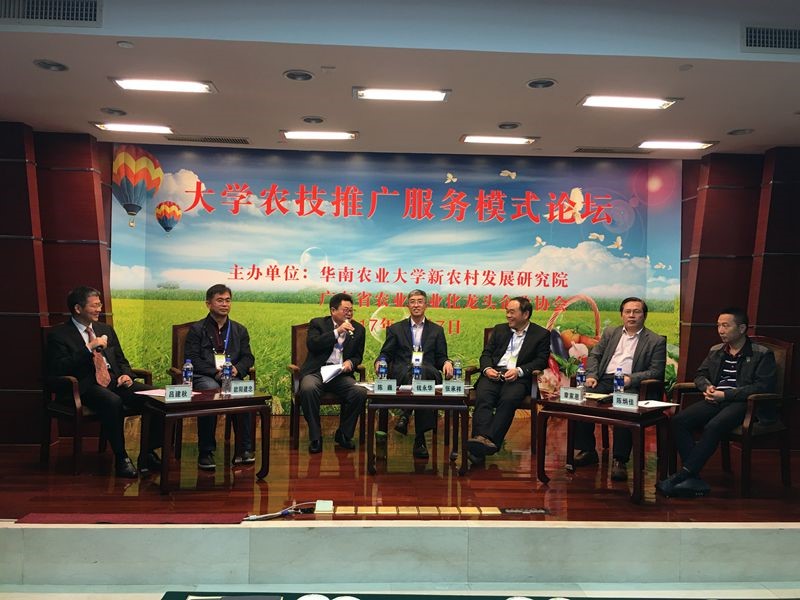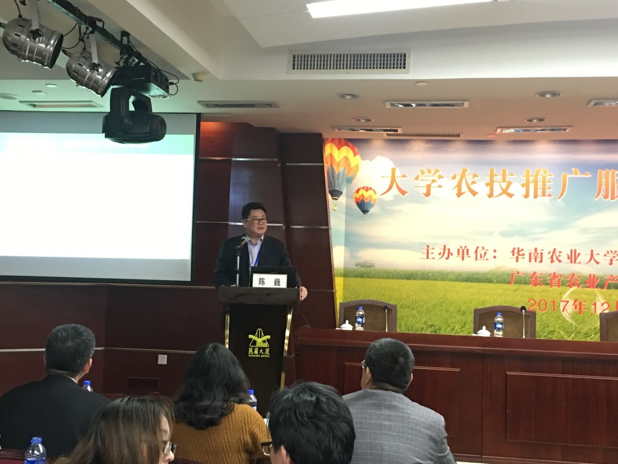 12月7日,全国大学农技推广模式论坛在广州召开。华南农业大学副校长咸春龙,西北农林大学副校长钱永华,全国农业推广中心体系处处长田有国,以及来自西北农林大学、沈阳农业大学、华南农业大学、广东省农业企业等近140名代表参会。我校新农办主任陈巍、副主任牟静等参加此次论坛。华南农业大学新农村发展研究院常务副院长吕建秋主持。